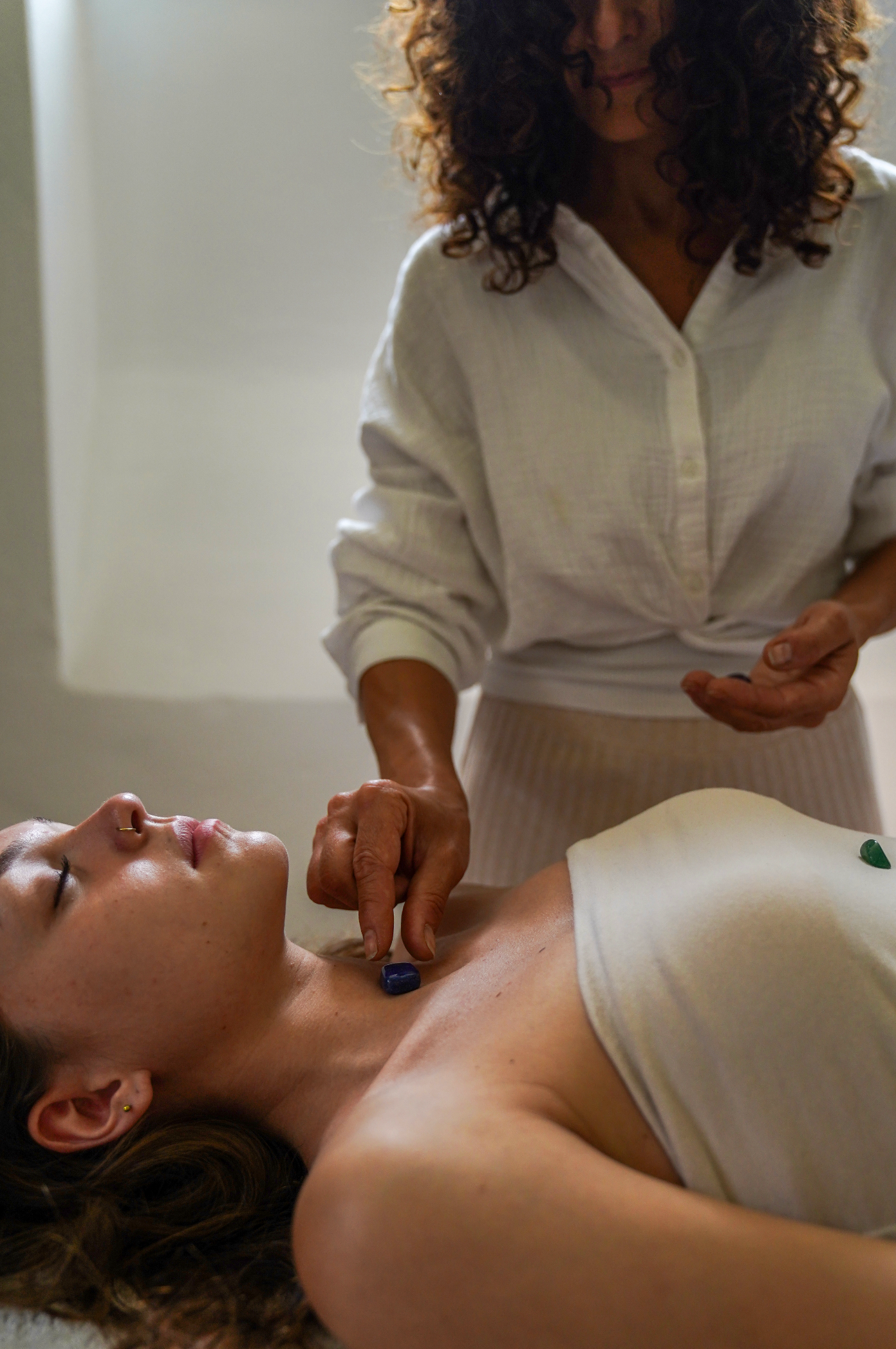 Proseguendo nella seduta, la persona viene fatta distendere e sul suo corpo (più precisamente in corrispondenza dei sette chakra - i nostri principali punti energetici) vengono gradualmente appoggiati i cristalli più adatti a risolvere o a dare supporto alle problematiche individuate.